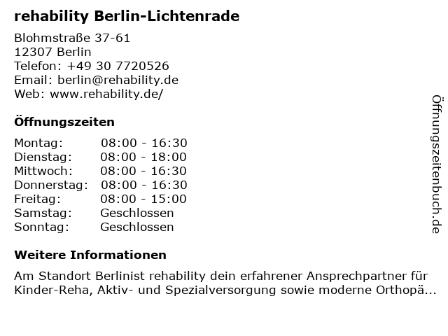 | Öffnungszeiten rehability Berlin-Lichtenrade in Berlin anzeigen | |