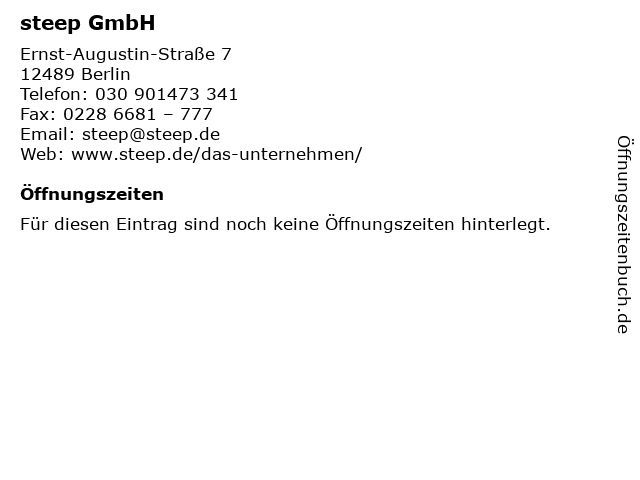 | Öffnungszeiten steep GmbH in Berlin anzeigen | |