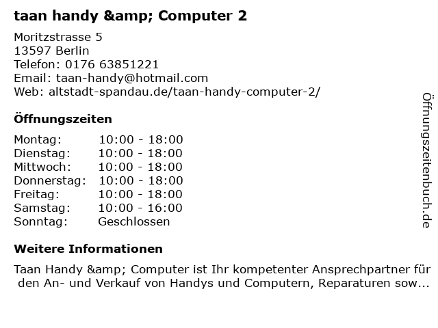 | Öffnungszeiten taan handy & Computer 2 in Berlin anzeigen | |