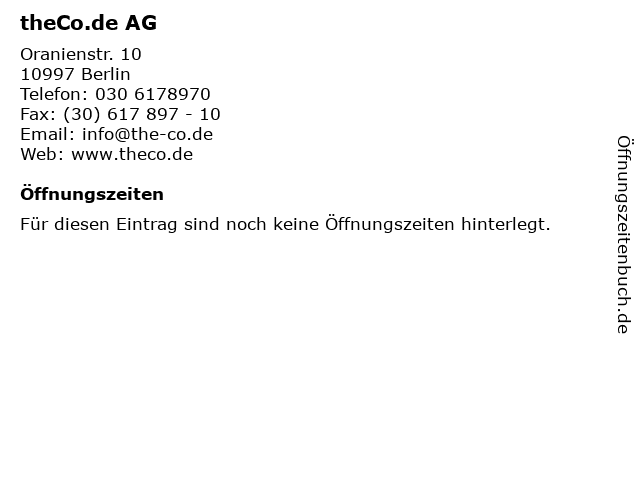 | Öffnungszeiten theCo.de AG in Berlin anzeigen | |