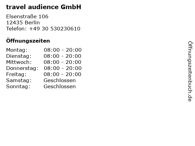 | Öffnungszeiten travel audience GmbH in Berlin anzeigen | |