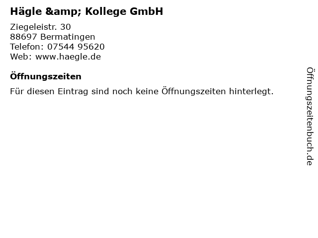| Öffnungszeiten Hägle & Kollege GmbH in Bermatingen anzeigen | |