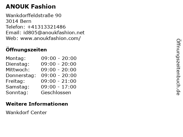 | Öffnungszeiten ANOUK Fashion in Bern anzeigen | |