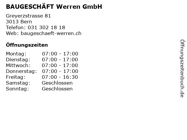 | Öffnungszeiten BAUGESCHÄFT Werren GmbH in Bern anzeigen | |