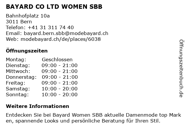 | Öffnungszeiten BAYARD CO LTD WOMEN SBB in Bern anzeigen | |