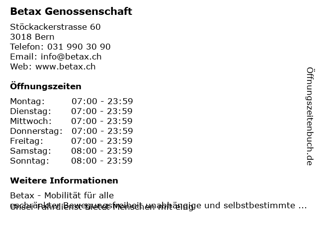 | Öffnungszeiten Betax Genossenschaft in Bern anzeigen | |