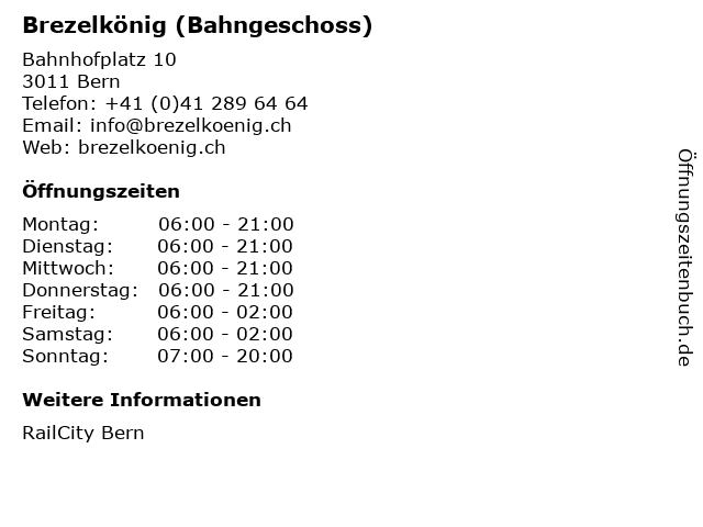 | Öffnungszeiten Brezelkönig (Bahngeschoss) in Bern anzeigen | |
