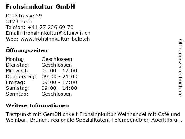 | Öffnungszeiten Frohsinnkultur GmbH in Bern anzeigen | |