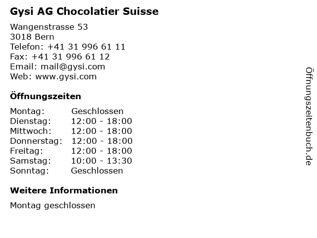 | Öffnungszeiten Gysi AG Chocolatier Suisse in Bern anzeigen | |