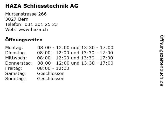 | Öffnungszeiten HAZA Schliesstechnik AG in Bern anzeigen | |