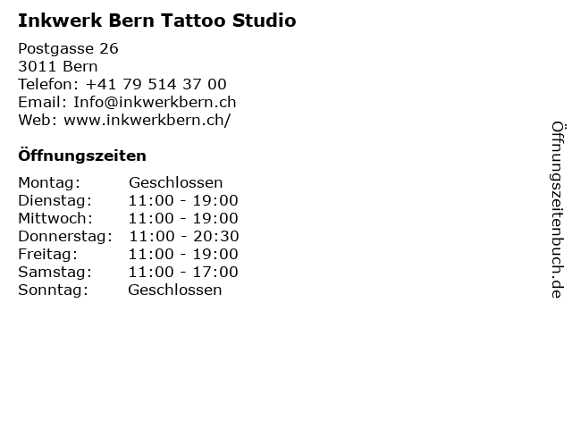 | Öffnungszeiten Inkwerk Bern Tattoo Studio in Bern anzeigen | |