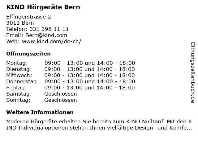 | Öffnungszeiten KIND Hörgeräte Bern in Bern anzeigen | |