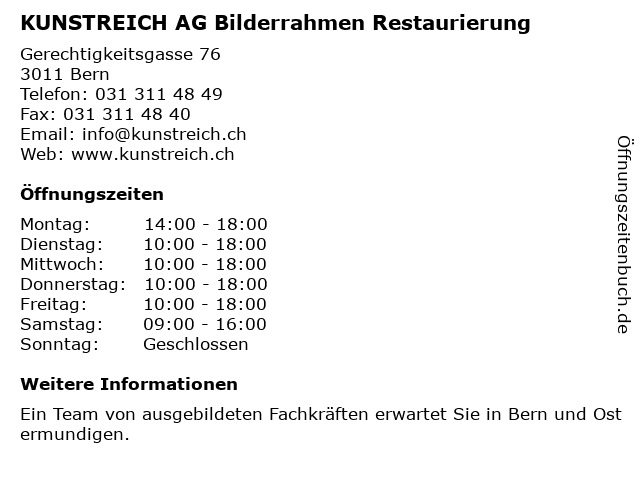 1 KUNSTREICH AG Bilderrahmen Restaurierung (Entfernung: 3,12 km) Mitteldorfstrasse 1, 3072 Ostermundigen 6 |