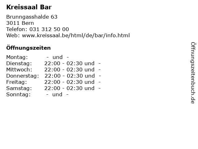 | Öffnungszeiten Kreissaal Bar in Bern anzeigen | |