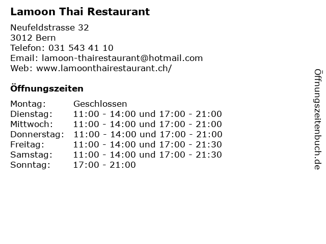 | Öffnungszeiten Lamoon Thai Restaurant in Bern anzeigen | |