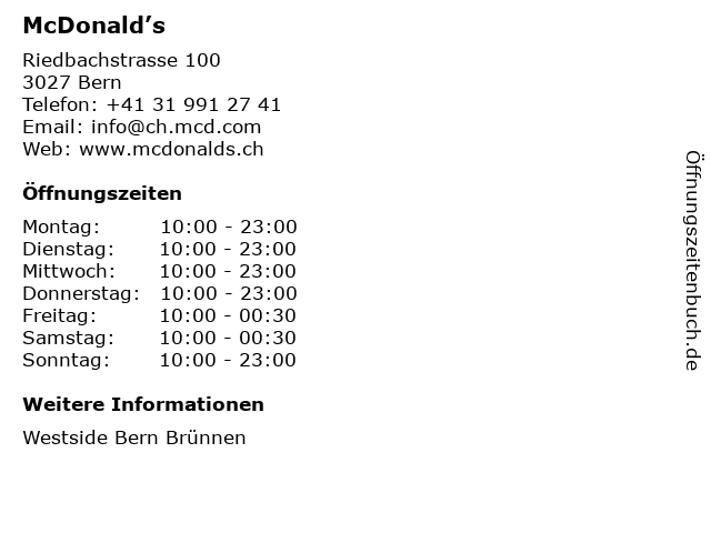 | Öffnungszeiten McDonald’s in Bern anzeigen | |