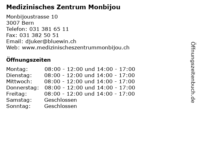 | Öffnungszeiten Medizinisches Zentrum Monbijou in Bern anzeigen | |