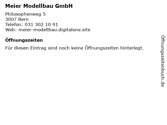 | Öffnungszeiten Meier Modellbau GmbH in Bern anzeigen | |