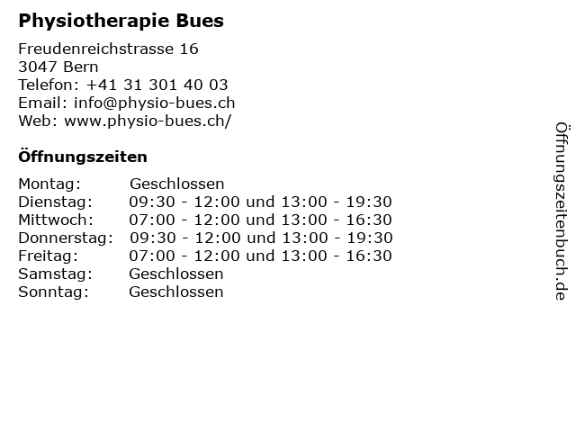 | Öffnungszeiten Physiotherapie Bues in Bern anzeigen | |