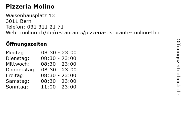 | Öffnungszeiten Pizzeria Molino in Bern anzeigen | |