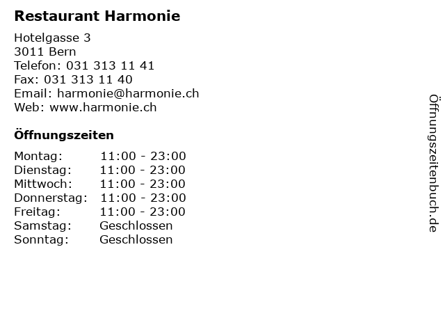 | Öffnungszeiten Restaurant Harmonie in Bern anzeigen | |