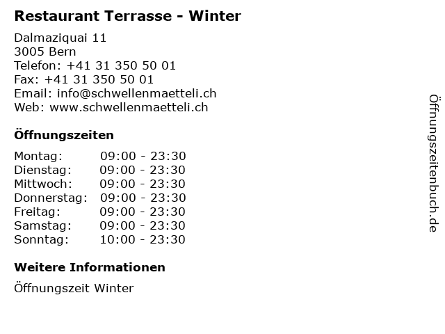| Öffnungszeiten Restaurant Terrasse - Winter in Bern anzeigen | |