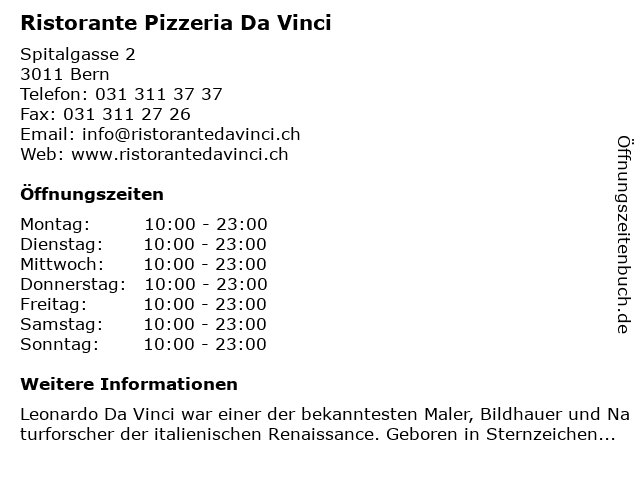 | Öffnungszeiten Ristorante Pizzeria Da Vinci in Bern anzeigen | |