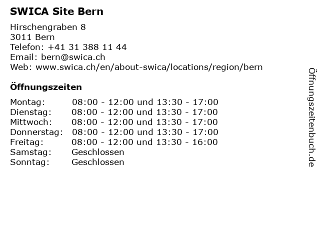 | Öffnungszeiten SWICA Site Bern in Bern anzeigen | |