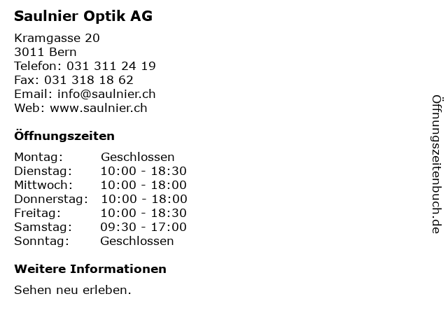 | Öffnungszeiten Saulnier Optik AG in Bern anzeigen | |