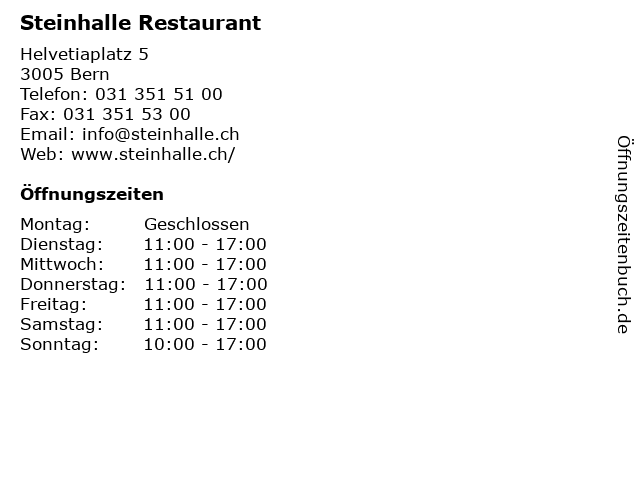 | Öffnungszeiten Steinhalle Restaurant in Bern anzeigen | |