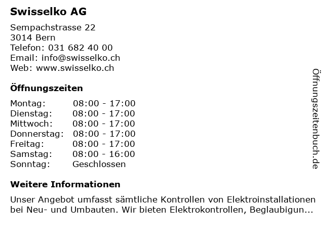| Öffnungszeiten Swisselko AG in Bern anzeigen | |