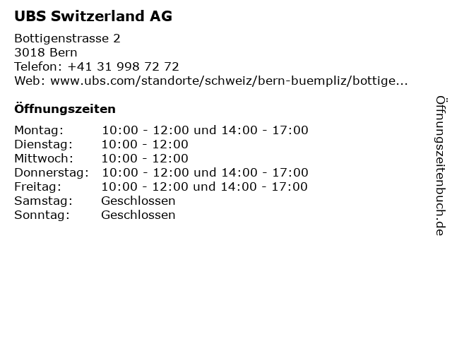 | Öffnungszeiten UBS Switzerland AG in Bern anzeigen | |