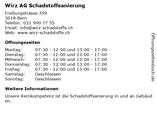 | Öffnungszeiten Wirz AG Schadstoffsanierung in Bern anzeigen | |
