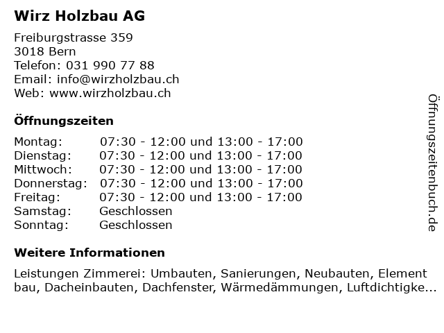 | Öffnungszeiten Wirz Holzbau AG in Bern anzeigen | |