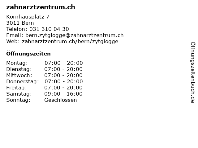 | Öffnungszeiten zahnarztzentrum.ch in Bern anzeigen | |