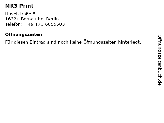 | Öffnungszeiten MK3 Print in Bernau bei Berlin anzeigen | |