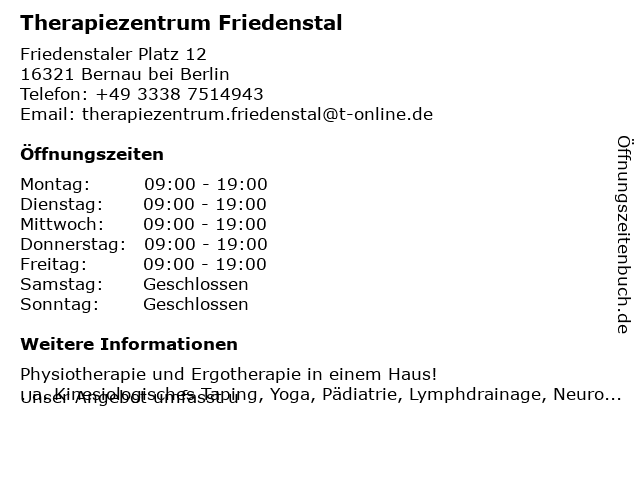 2 Therapiezentrum im Kiez (Standort Hellersdorf) (Entfernung: 15,84 km) Schwarzheider Str. 7, 12627 Berlin 5 Therapiezentrum Frohnau / Glienicke Katrin Winterfeldt (Entfernung: 17,14 km) Leipziger Str. 1, 16548 Glienicke 6 Therapiezentrum Bötzowviertel GbR Physiotherapie (Entfernung: 17,36 km) Pasteurstr. 31, 10407 Berlin-Prenzlauer Berg |