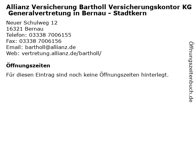 | Allianz Versicherung Bartholl Versicherungskontor KG Generalvertretung in Bernau - Stadtkern anrufen | |