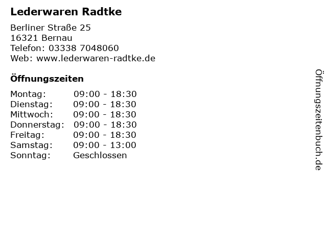 | Öffnungszeiten Lederwaren Radtke in Bernau anzeigen | |