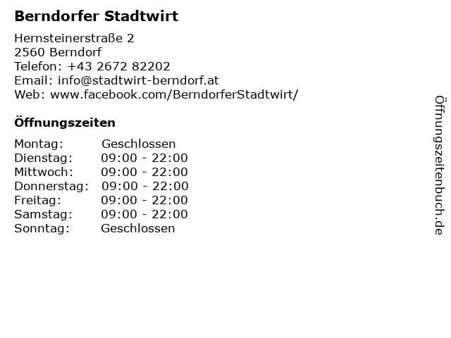 | Öffnungszeiten Berndorfer Stadtwirt in Berndorf anzeigen | |