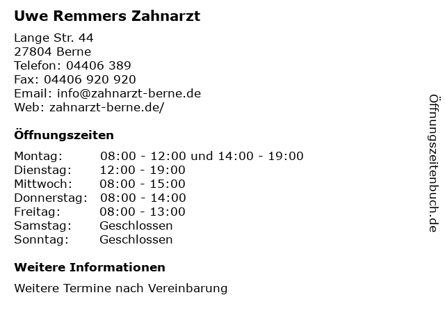 | Öffnungszeiten Uwe Remmers Zahnarzt in Berne anzeigen | |