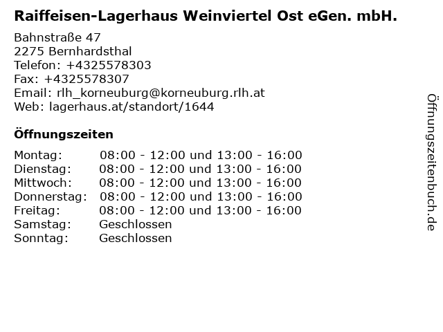 1 Raiffeisen-Lagerhaus Weinviertel Nordost reg.Gen.m.b.H. (Entfernung: 0,42 km) Hauptstraße 345, 2275 Bernhardsthal 3 Raiffeisenbank Bernhardsthal-Großkrut-Altlichtenwarth eGen - (Bankomat Bankstelle) (Entfernung: 0,83 km) Hauptstraße 95, 2275 Bernhardsthal 6 Raiffeisen-Lagerhaus Weinviertel Mitte eGen. mbH. - Tankstelle (Entfernung: 7,70 km) Bahnstraße 426, 2144 Altlichtenwarth |