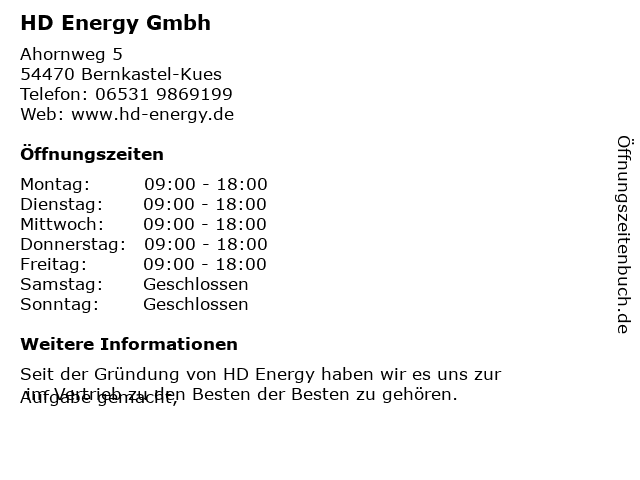 | Öffnungszeiten HD Energy Gmbh in Bernkastel-Kues anzeigen | |