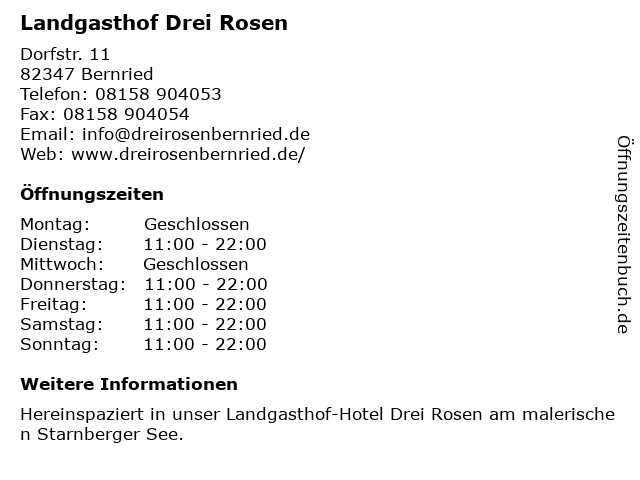 | Öffnungszeiten Landgasthof Drei Rosen in Bernried anzeigen | |