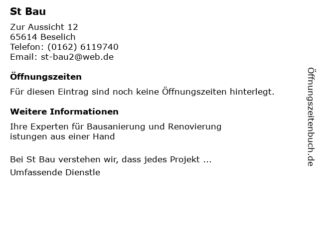 | Telefonnummer St Bau in Beselich ((0162) 6119740) anrufen | |