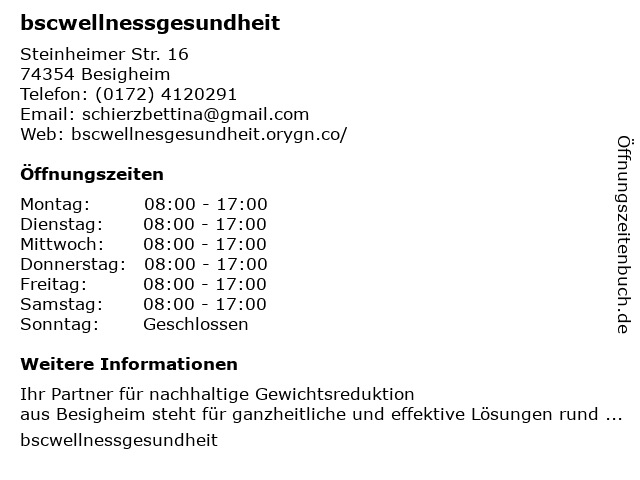 | Öffnungszeiten bscwellnessgesundheit in Besigheim anzeigen | |