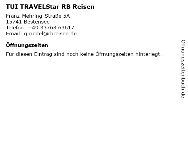 | Öffnungszeiten TUI TRAVELStar RB Reisen in Bestensee anzeigen | |