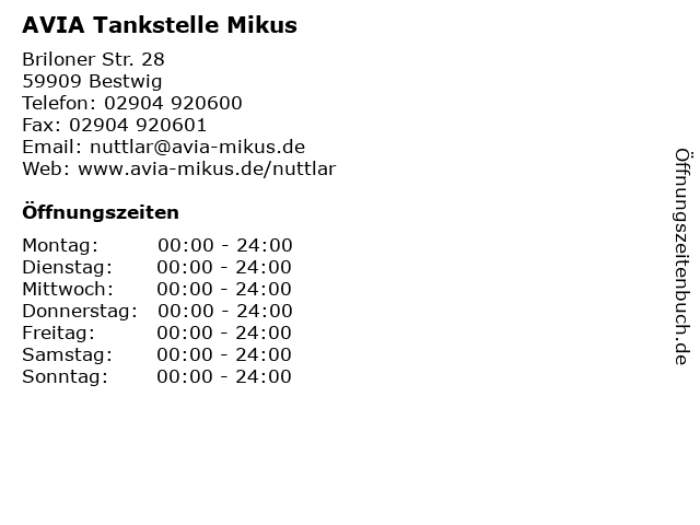 | Öffnungszeiten AVIA Tankstelle Mikus in Bestwig anzeigen | |