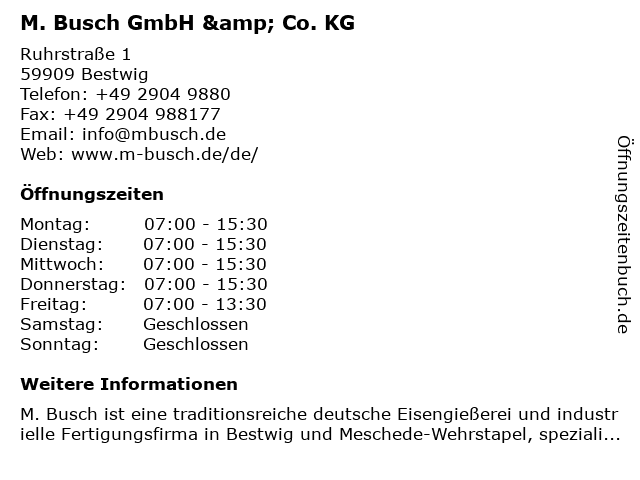 | Öffnungszeiten M. Busch GmbH & Co. KG in Bestwig anzeigen | |