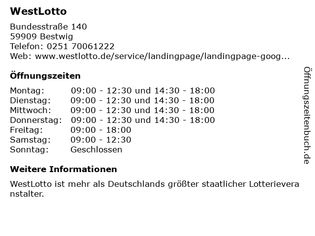 | Öffnungszeiten WestLotto in Bestwig anzeigen | |